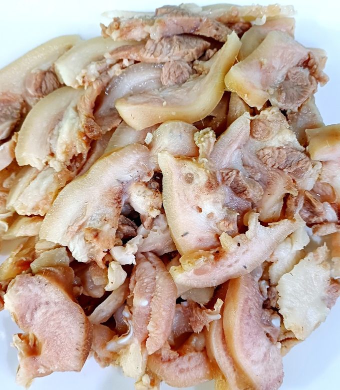 Mũi Heo Luộc Chấm: Luộc chín, thái mỏng, ăn kèm mắm gừng hoặc mắm tỏi ớt.
